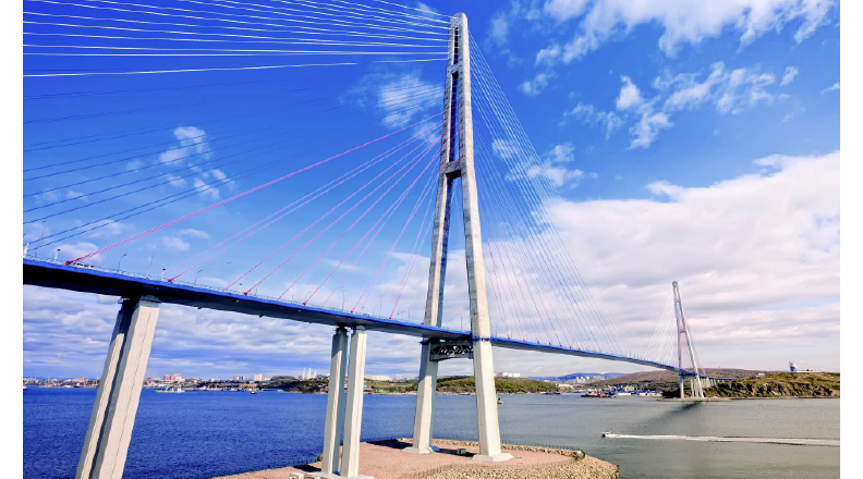 ルースキー島 (Russky Island) に向かうこの橋は、主径間長が 1,104m に及ぶ世界最長級の斜張橋の一つであり、橋梁建設の新たな歴史を刻みました。
