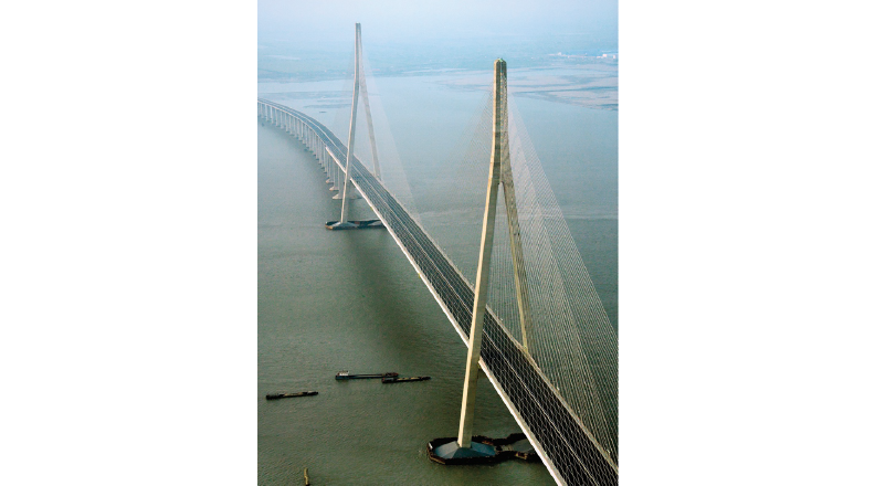 蘇通大橋 (Sutong Bridge) は、蘇州市 (苏州) と南通市 (南通) を結ぶ往復6車線の橋梁です。全長は 8km、主橋の主径間は 1,088m の斜張橋で、世界で初めて径間長が 1,000m を超える記録を達成しました。さらに、コンクリート橋である補助航路橋の主径間は 268m、接続橋の径間長は 45m~75m です。