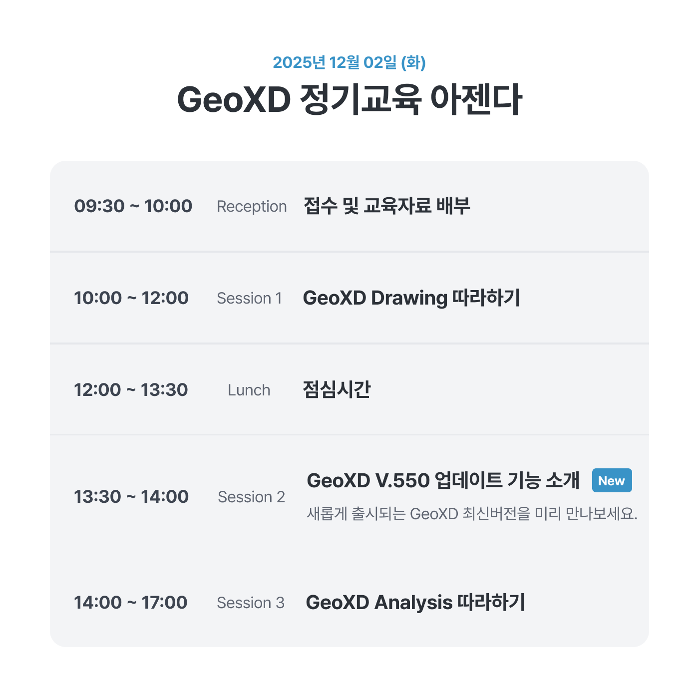 GeoXD Drawing & Analysis 기본 과정 실습도 함께 진행 될 예정입니다.