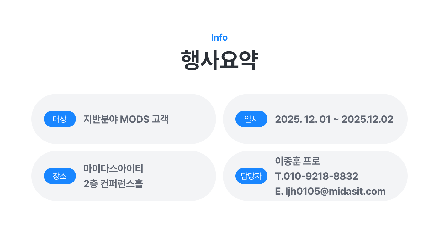 - 세미나실 수용 인원 제한으로 선착순 60명으로 교육이 진행 됩니다. (MODS 고객사 대상)