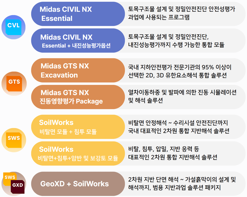 ※ 아래 모듈은 프로그램 별 대표적으로 사용되는 모듈입니다. 아래 담당자와 상담하시면 수행하시는 과업에 적합한 프로그램과 모듈을 상세히 확인하실 수 있습니다.